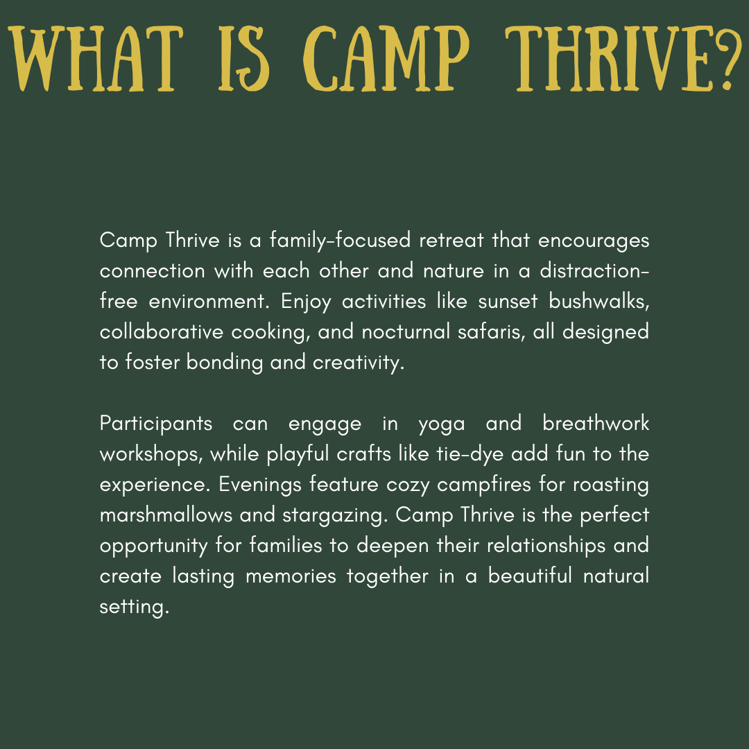 Camp Thrive is a unique retreat designed to foster family connections, immerse participants in nature, and provide an all-inclusive experience free from everyday distractions. Set in a serene environment, Camp Thrive invites families to step away from the hustle and bustle of daily life and reconnect with one another and the natural world.